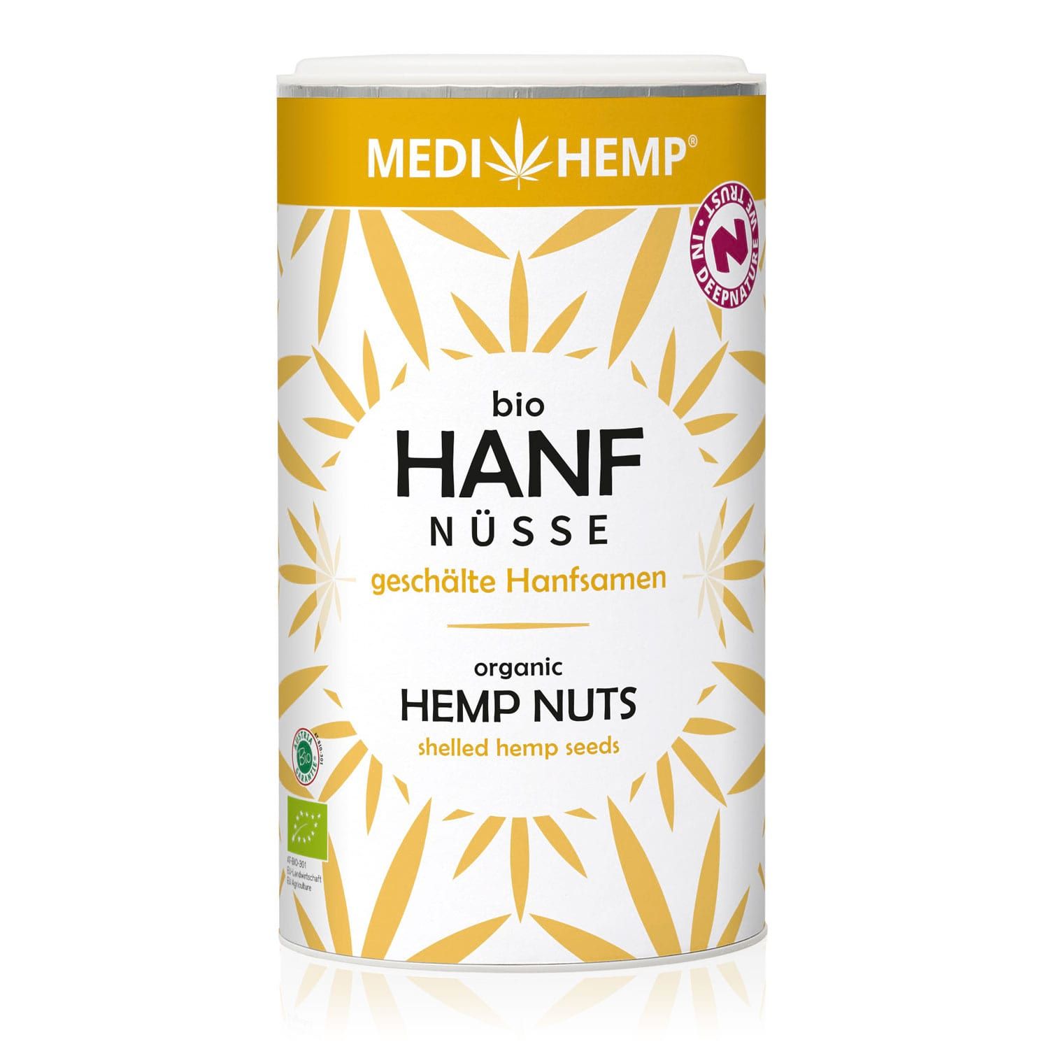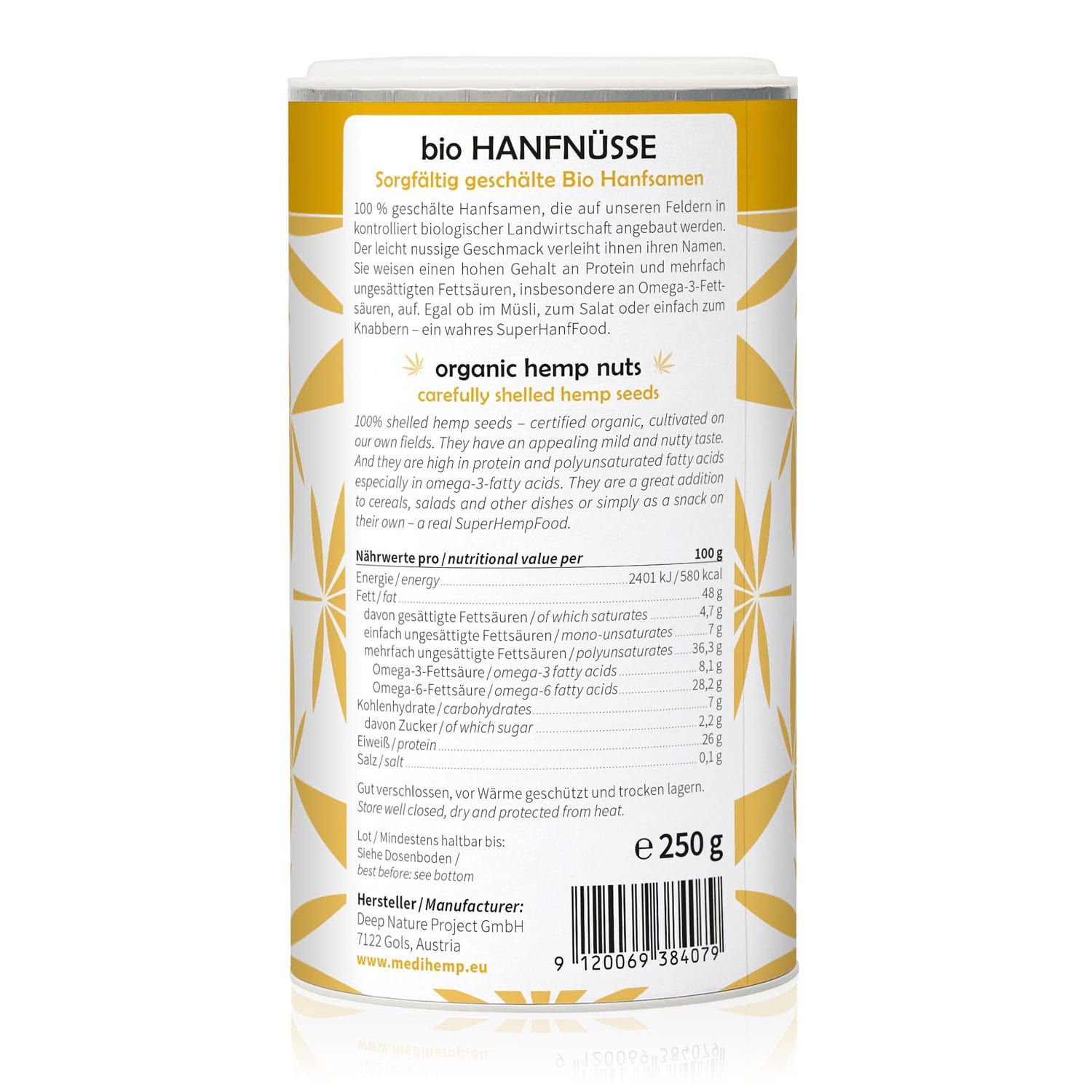 100 % geschälte Hanfsamen, die auf Medihemps Feldern in kontrolliert biologischem Landbau kultiviert werden. Der leicht nussige Geschmack verleiht ihnen ihre Namensgebung. Sie verfügen über einen hohen Gehalt an Eiweiß und mehrfach ungesättigten Fettsäuren, speziell an Omega-3-Fettsäuren. Egal ob im Müsli, zu einem Salat oder nur zum Naschen – ein echtes SuperHanfFood.