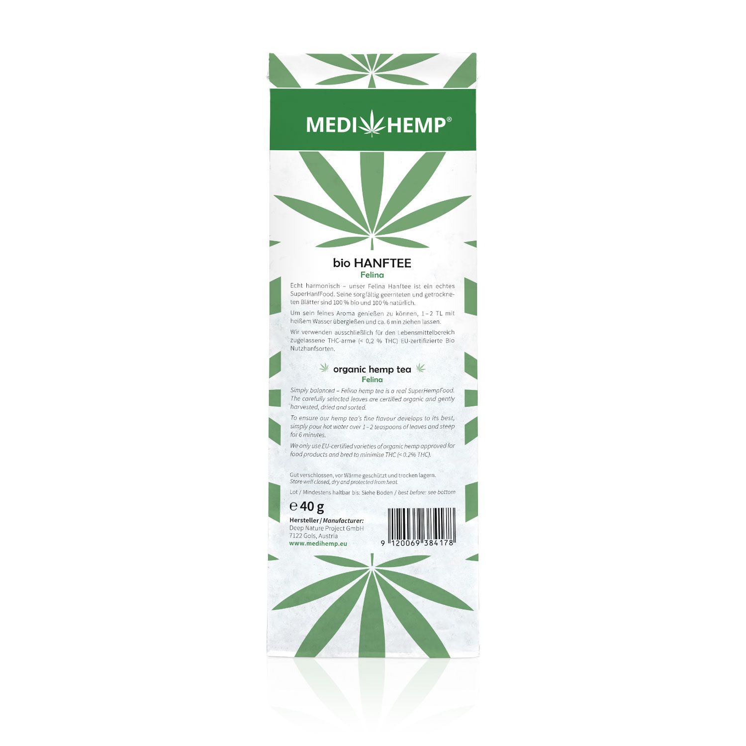 Natürlich harmonisch - unser Hanftee von Felina ist ein echtes SuperHanfFood. Seine schonend geernteten und getrockneten Blätter sind 100% bio und 100% naturbelassen. Um sein feines Aroma genießen zu können, 1-2 TL mit heißem Wasser übergießen und etwa 6 min ziehen lassen. Wir nutzen ausschließlich für den Lebensmittelbereich freigegebenen THC-arme EU-zertifizierte Bio Nutzhanfsorten. THC Gehalt kleiner 0,2 %.